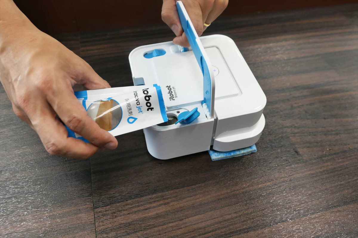 これに伴い、専用洗剤も開発しました。これまで、本体タンクには水だけしか入れられませんでしたが、洗って繰り返し使えるウエットパッドのニーズが高く、単なる水拭きではなく洗剤でしっかり汚れを落としたいというニーズも踏まえて開発したものです。新モデルには1回使い切りパックをそれぞれ2包ずつ付属しますが、夏にはオプション販売用にボトルを発売する予定です。価格はアイロボットストア価格で880円(税別)。