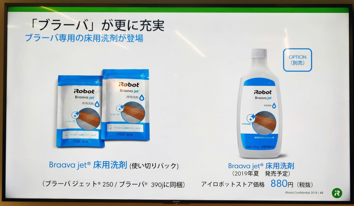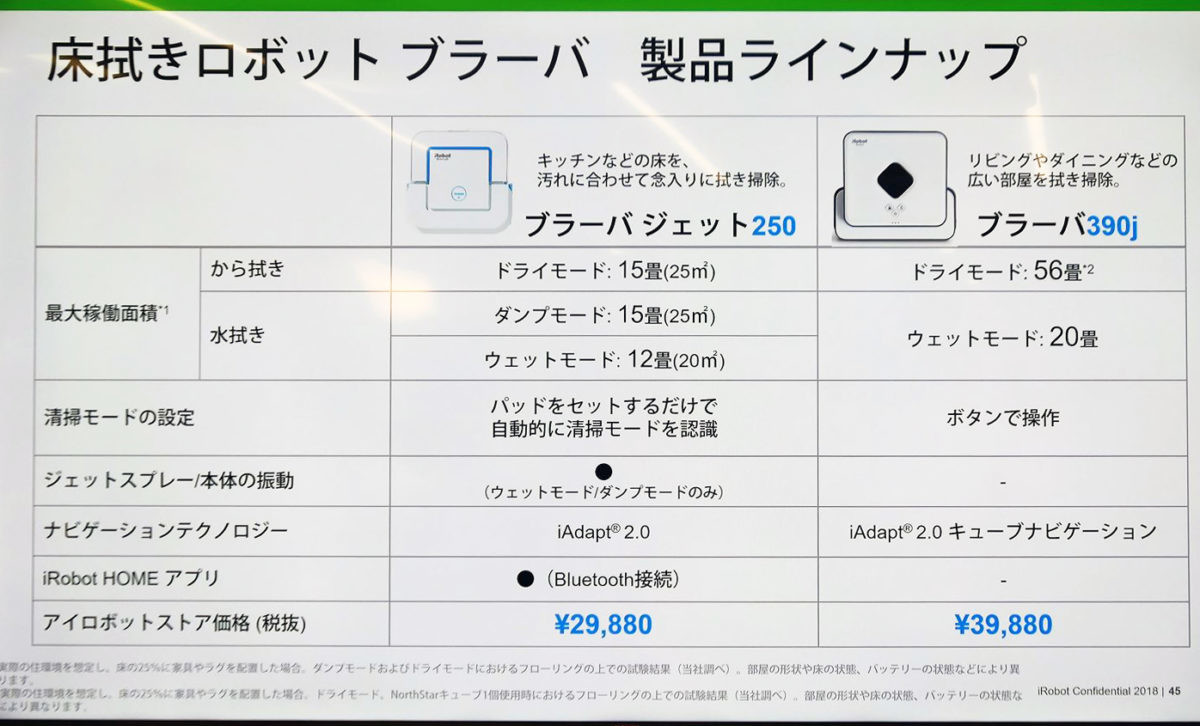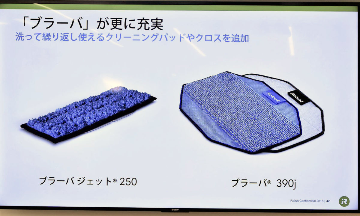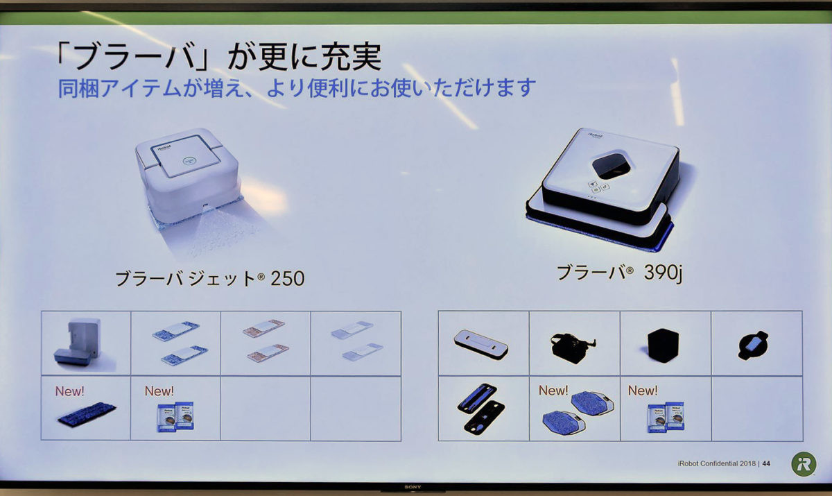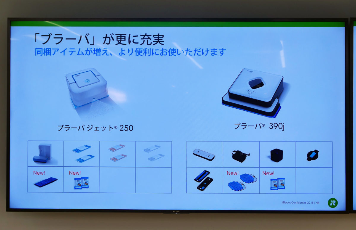 同社はこの日、床拭きロボット「ブラーバ」の新製品「ブラーバ ジェット250」「ブラーバ390j」も同時発表しました。新製品は、機能・性能・価格はそのままに、ユーザーの要望に応じて付属品を充実させたものです。価格はブラーバ ジェット250が2万9880円、ブラーバ390jは3万9880円で前モデルから据え置きです(ともにアイロボットストア価格、税別)。