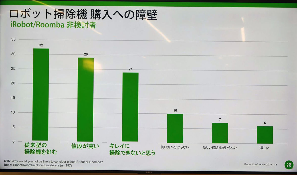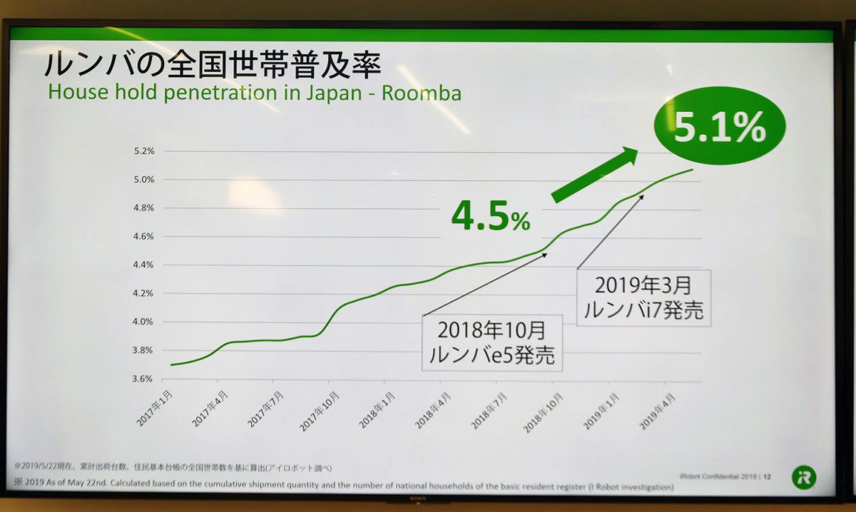 アイロボットジャパンの代表執行役員社長・挽野 元氏によると、日本におけるルンバの普及率は5.1%。「昨年発売したルンバe5と今年発売したルンバi7により普及率は上昇したが、当社目標の、2023年までに10%という数値にはまだまだ及ばない。10%という数値さえも当社にとっては通過点で、最終目標は一家に一台です」。
