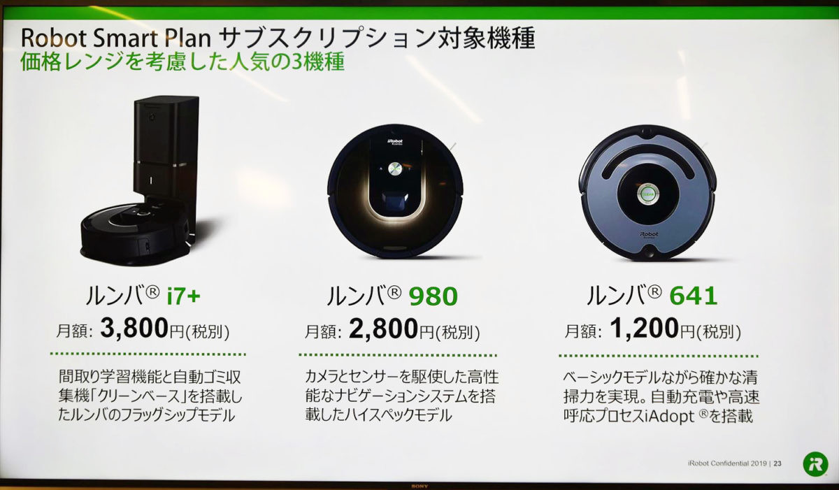 ロボスマの対象製品は、自動ごみ収集機付属のフラグシップモデル「ルンバi7+」(月額3800円以下すべて税別)、ハイスペックモデルの「ルンバ980」(月額2800円)、ベーシックモデルの「ルンバ641」(月額1200円)の3機種。対象機種は、今回の反応を見て拡大を検討するとしています。