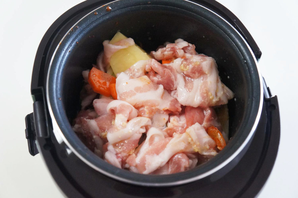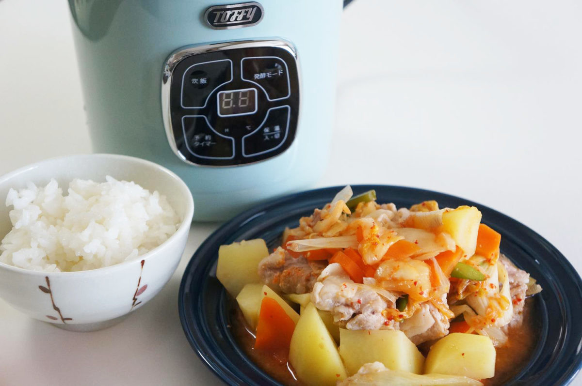 Toffy マイコン炊飯器は、炊飯だけでなく、おかず作りにも使えるのが強みです。今回は公式レシピとして紹介されていた「キムチ肉じゃが」を作ってみました。作り方は簡単で、材料を釜にセットして「炊飯」モードで必要に応じた時間加熱するだけ。