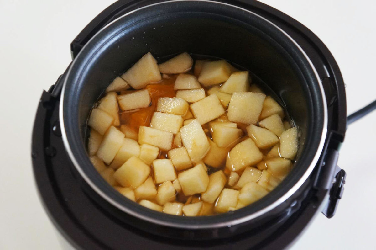 炊飯モードを使った調理だけでなく、「発酵」モードを使えばこれ一台で発酵食品も作れます。発酵食品といえば、ヨーグルトや甘酒、塩麹などが代表的な例ですが、完成する量が多いのでひとり暮らしだと自作するのはなかなかハードルが高いもの。そこで試してみたのが「果実酢」作りです。