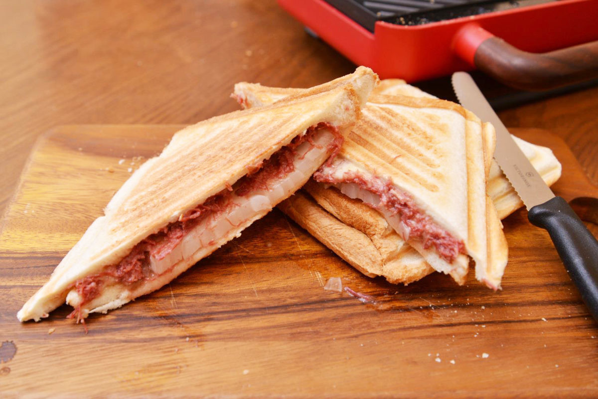それでは、さっそく使ってみましょう! まずは本職のホットサンドを焼くことから。付属のレシピブックより、今回は「チーズコンビーフ」のホットサンドをセレクトしました。