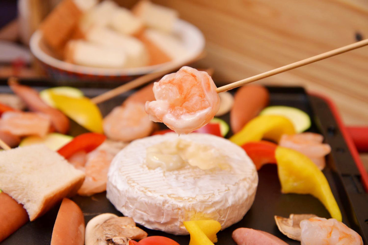 ウインナー、エビ、野菜やパンをひと口サイズにカットして、プレートの上に並べます。カマンベールチーズはホールのまま両面を軽く焼いたあと、上面を少しくり抜いたら準備完了。チーズをココット代わりに使った、見た目も楽しいアイデア料理です。