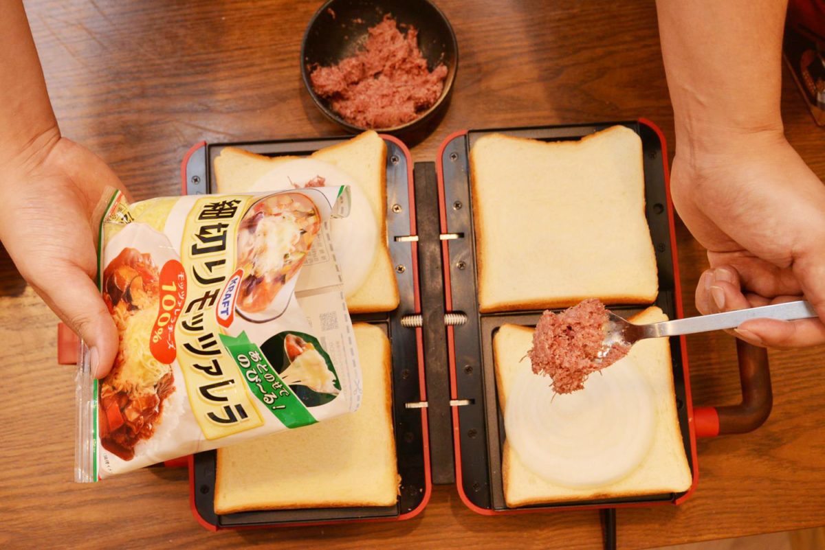 6枚切りの食パンをプレートに収まるようにセットして、その上にコンビーフ、スライスした玉ねぎ、モッツァレラチーズをのせます。具材をのせたら、もう1枚の食パンをのせ、上のプレートで押しつぶすようにはさみます。