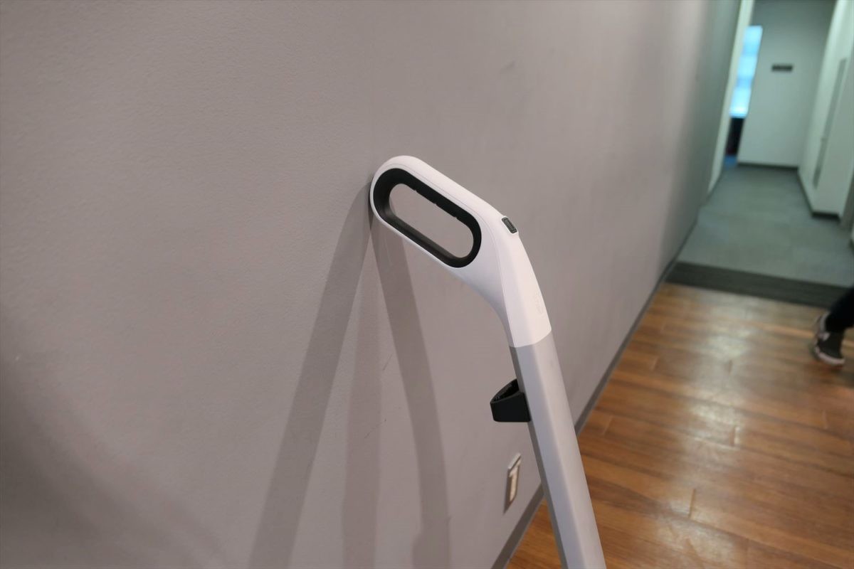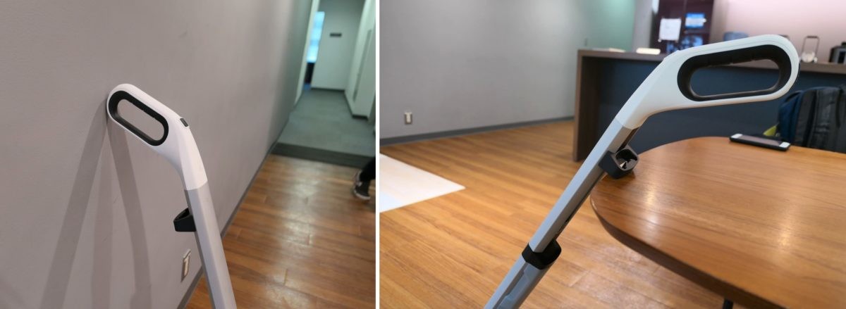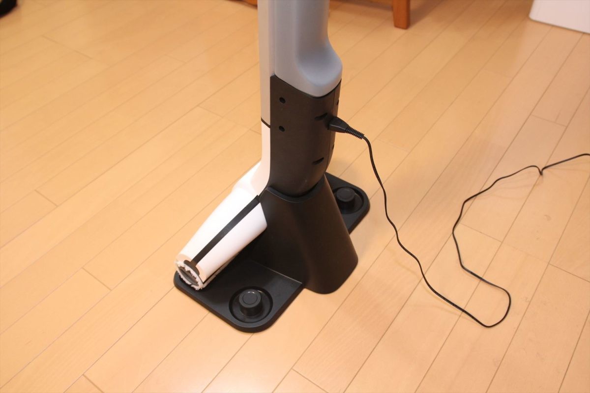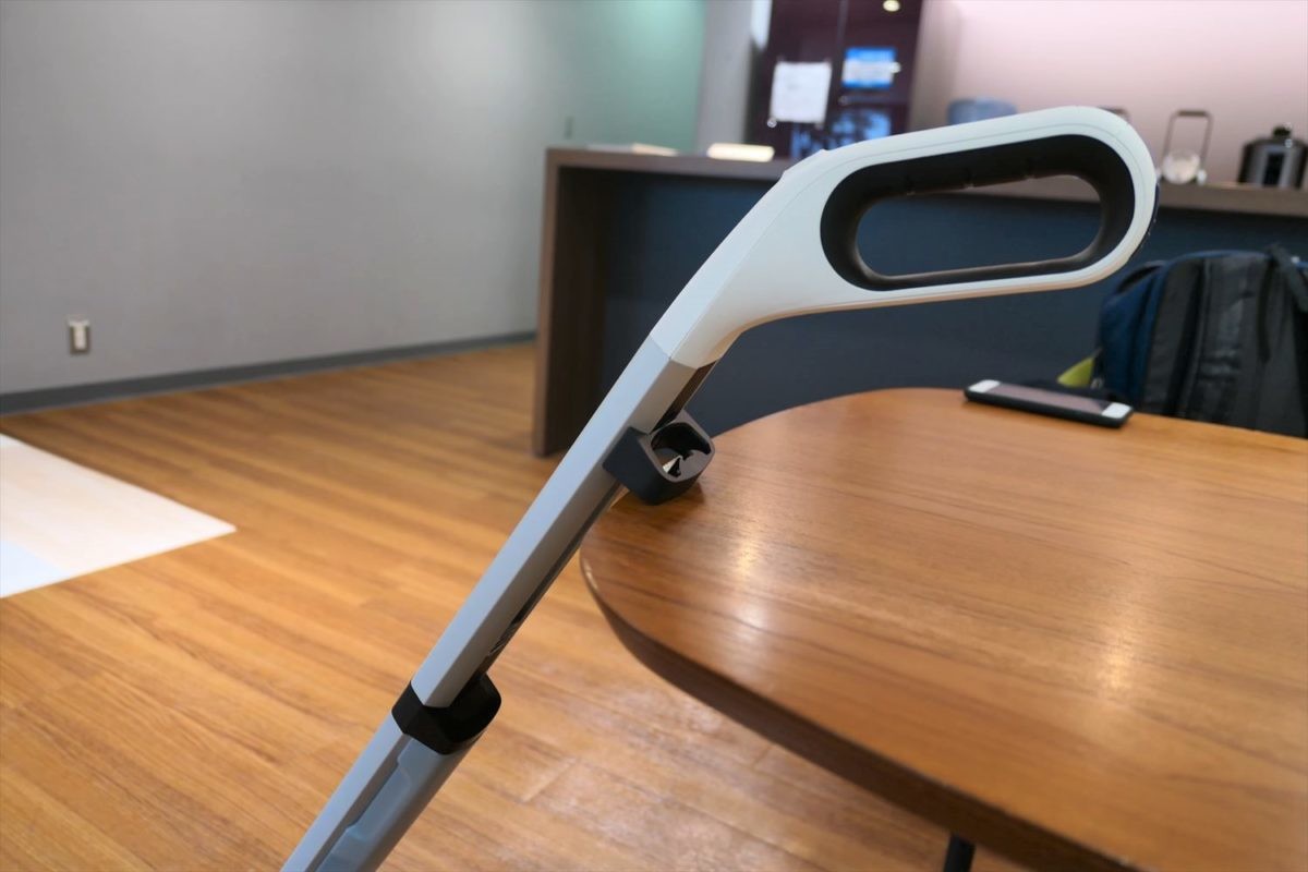 そのほか、グリップの裏側にゴムがついているので、壁に立てかけても滑らないのがうれしいところ。スティック収納用のフックを使って家具に立てかけることもできるので、掃除をちょっと中断するときに便利です。