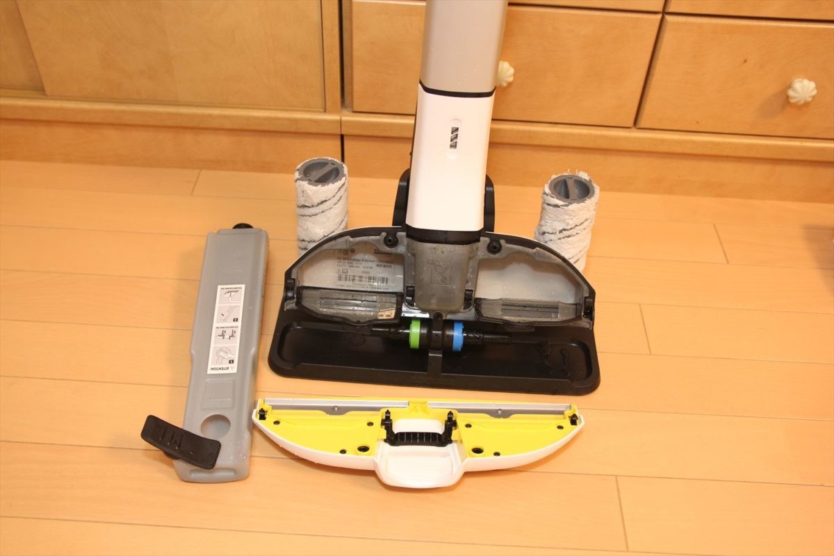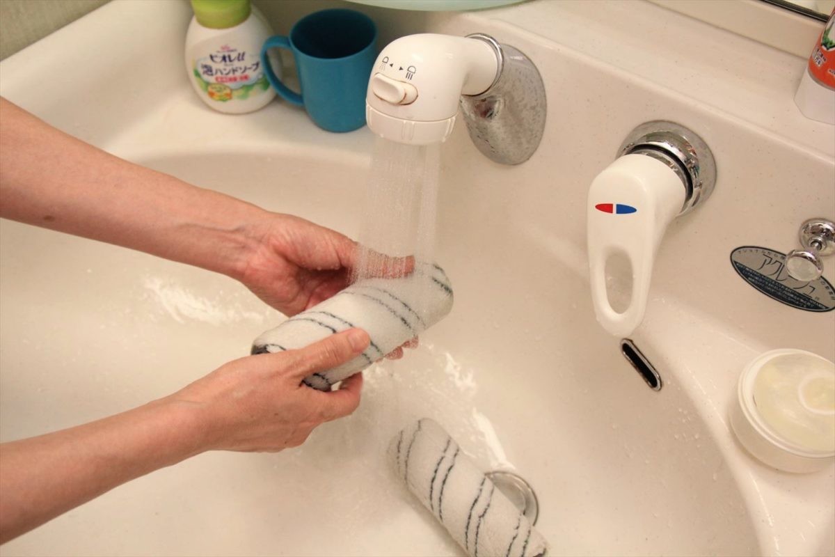 お手入れもカンタン。使用後はヘッド内部の汚水タンクの汚水を捨てて軽く水洗いし、ローラーも流水で洗えば何度でも使えます。洗った後は付属のスタンドにローラーを立てて干しておきます。