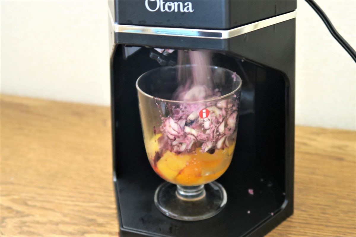 続いて、付属のレシピブックを見ていて気になった「フルーツパンチかき氷」を作ってみました。冷凍ベリー80gをグラニュー糖大さじ1と合わせ、固形のラムネ15g、ソーダ70gとともに製氷カップに入れて凍らせます。