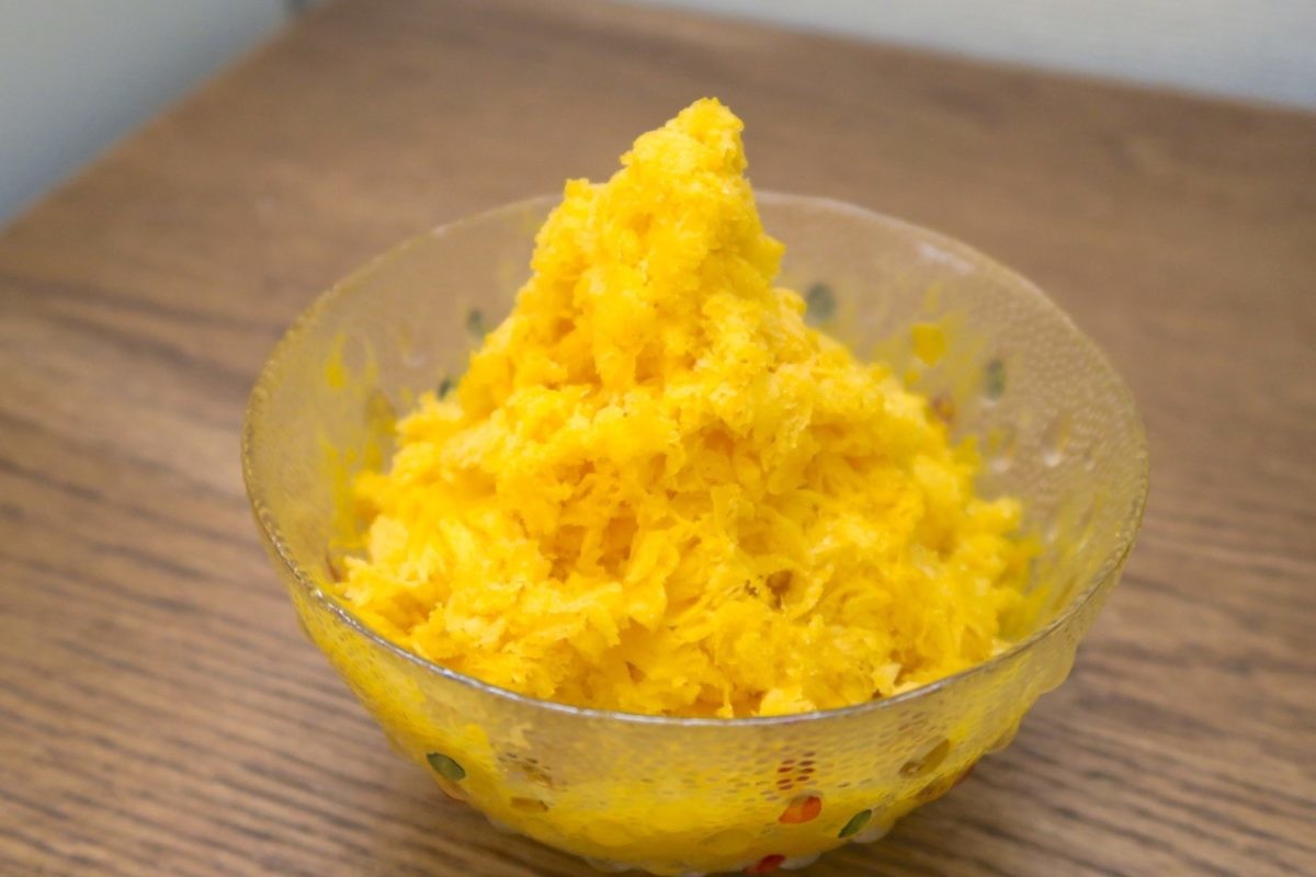 こちらが完成した台湾風マンゴーかき氷です。ひと目見るだけで、普段食べているかき氷とは異なる仕上がりなのがわかりますね。それではさっそく実食!