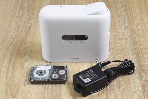 箱の中には、本体、ACアダプター、お試し用9mm幅テープが1つずつ入っています。本体のサイズは57(幅)×154(奥行)×137.5mm(高さ)で、重さは約425gほど。清潔感のある真っ白なボディが美しく、文字を打ち込むボタンはついていません。