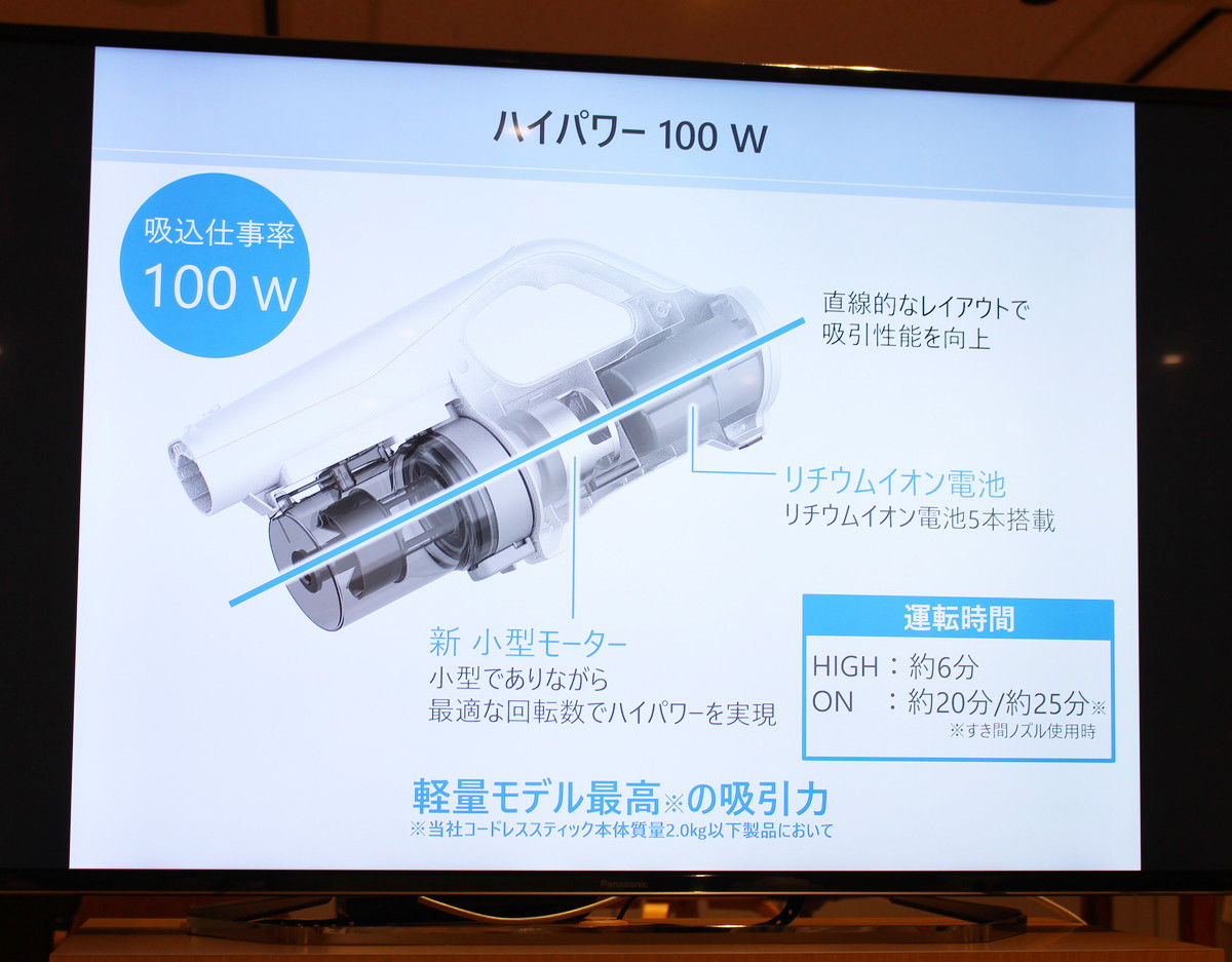 ここで湧いてくるのが「吸込仕事率100Wって強いの?」という疑問です。従来の「パワーコードレス」が約200Wなら、半分しかないのでは? とも思いますが、同社の調査によると吸込仕事率100Wは、市場に出回っている2㎏未満のコードレスのなかではトップクラス。主要な商品のなかでは、100Wに達していた製品はなかったといいます。