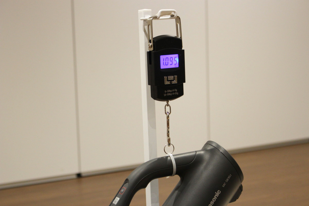 100Wの吸引力がいかにパワフルか、吸引力テストを行ったところ、3㎏もの重りが徐々に浮きはじめ、一番上まで登っていきました。これは確かにメイン機としても活躍できるパワーです。