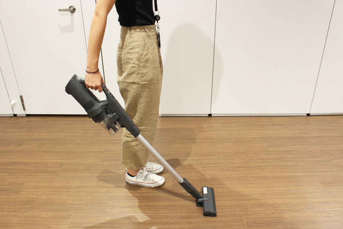 実際に掃除機を前後に動かしてみると、確かに腕をほとんど曲げることなく、自然な状態でかけられました。一方、少しでもハンドルの位置が違ったり、長すぎたりすると肘を不自然に引き上げることになり、意外と力が必要なことが分かりました。