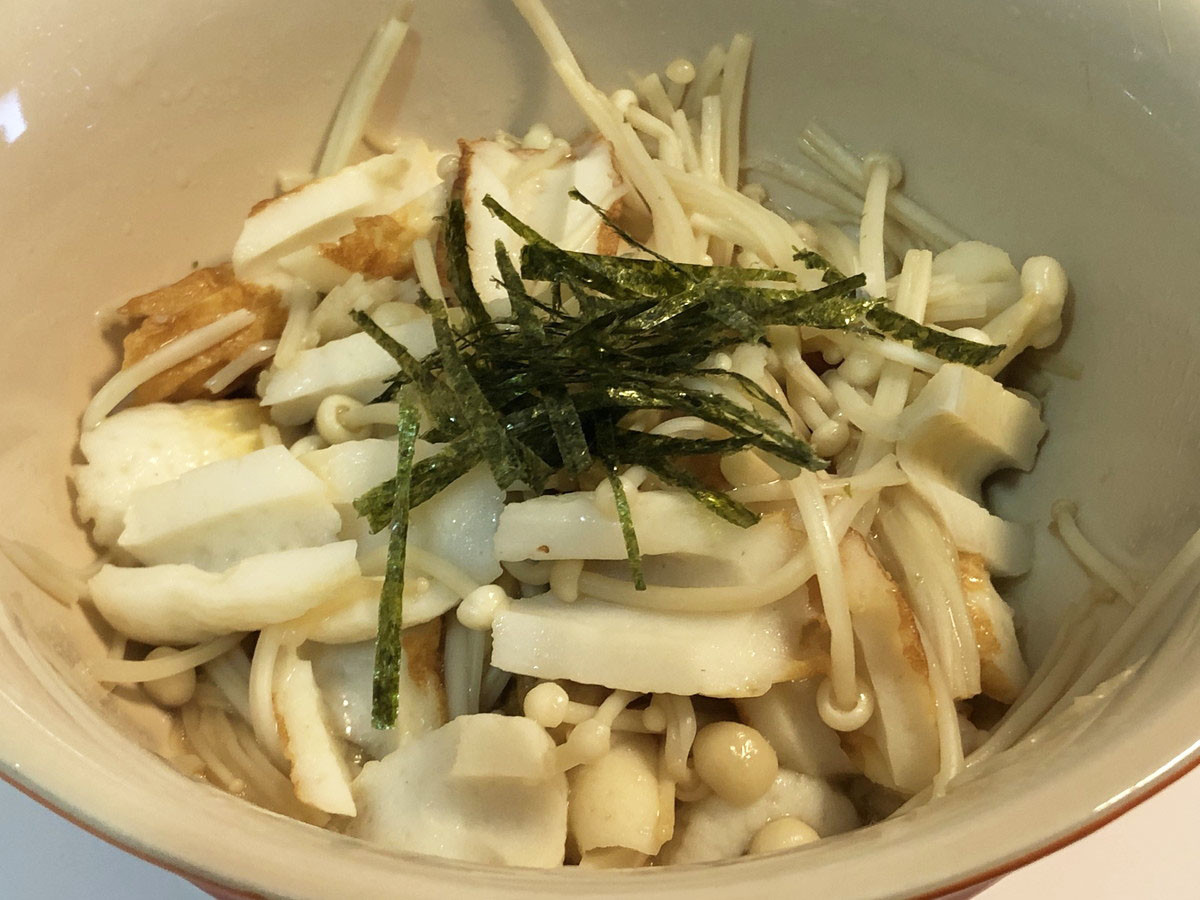 「えのきバターしょうゆ」はえのきとちくわ、調味料を混ぜ合わせてレンジで約1分20秒温めればできあがり。どちらも料理に慣れていない人がチャレンジするにはぴったりですね。