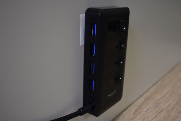 裏側の強力なマグネットを利用すれば、スチール製のデスクなどにガッチリ固定できます。さらにポートが一列に並んでいるので、ケーブルを一方向に接続可能。デスク周りを整理したい時に重宝するかも。