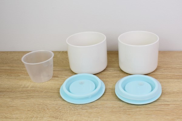 パッケージの中には本体とは別に、電源ケーブル・計量カップ・専用茶碗×2・専用茶碗フタ×2・取扱説明書が入っていました。陶器製の茶碗はツルツルとした手触りで、意外と頑丈に作られています。