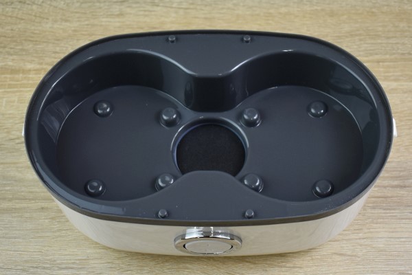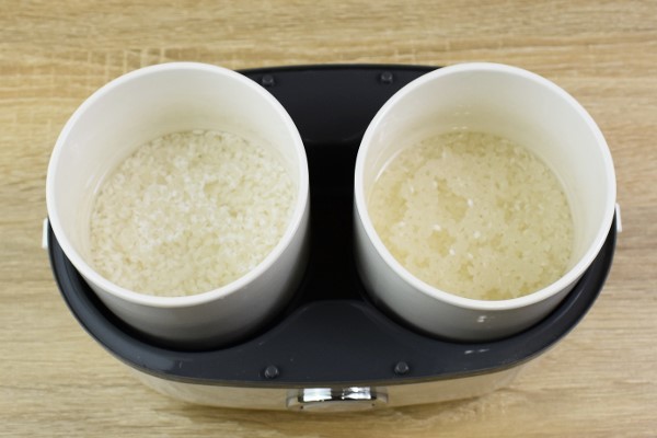 20分ぐらい時間が経過したところで、今度は茶碗のフタをせずに炊飯台へセット。1つでも炊くことができますが、今回は2つ同時に炊いていきます。炊飯台の中にも水160mlを加えて、あとは本体のフタを閉めてスイッチを押すだけ。ちなみに80mlのお米だけでなく、大盛りサイズ(120ml、炊きあがり230g:お茶碗大盛り程度)のお米を炊くことも可能です。その際は水の分量が変化するので注意してください。