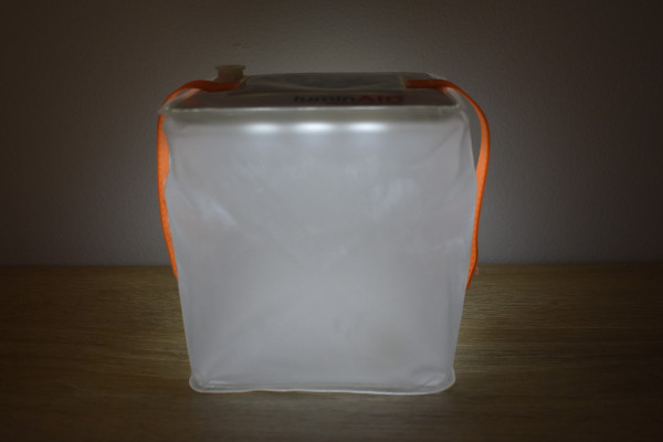 パンパンになった状態でスイッチをオンにすると、思っていた以上に明るいLEDライトが点灯。テントの天井などに吊るせるバンドもついており、ライトの役割を十分に果たしてくれますよ。