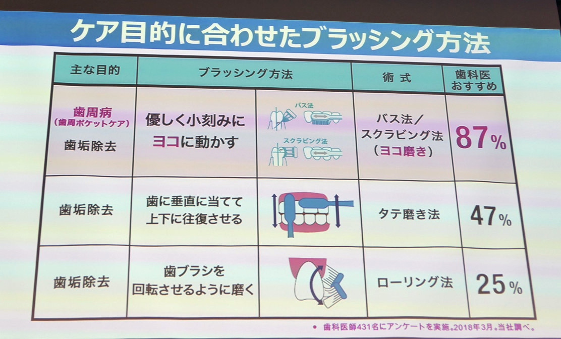 一方、むし歯の場合は、歯の表面の汚れを落とすことがポイントになります。歯の表面、さらに歯と歯の間の溝に入りこんだ汚れを落とすのに有効なのがヨコにブラシを動かすこと。パナソニックの調査によれば、歯科医師の87%がヨコに細かく動かす磨き方を推奨しているそう。