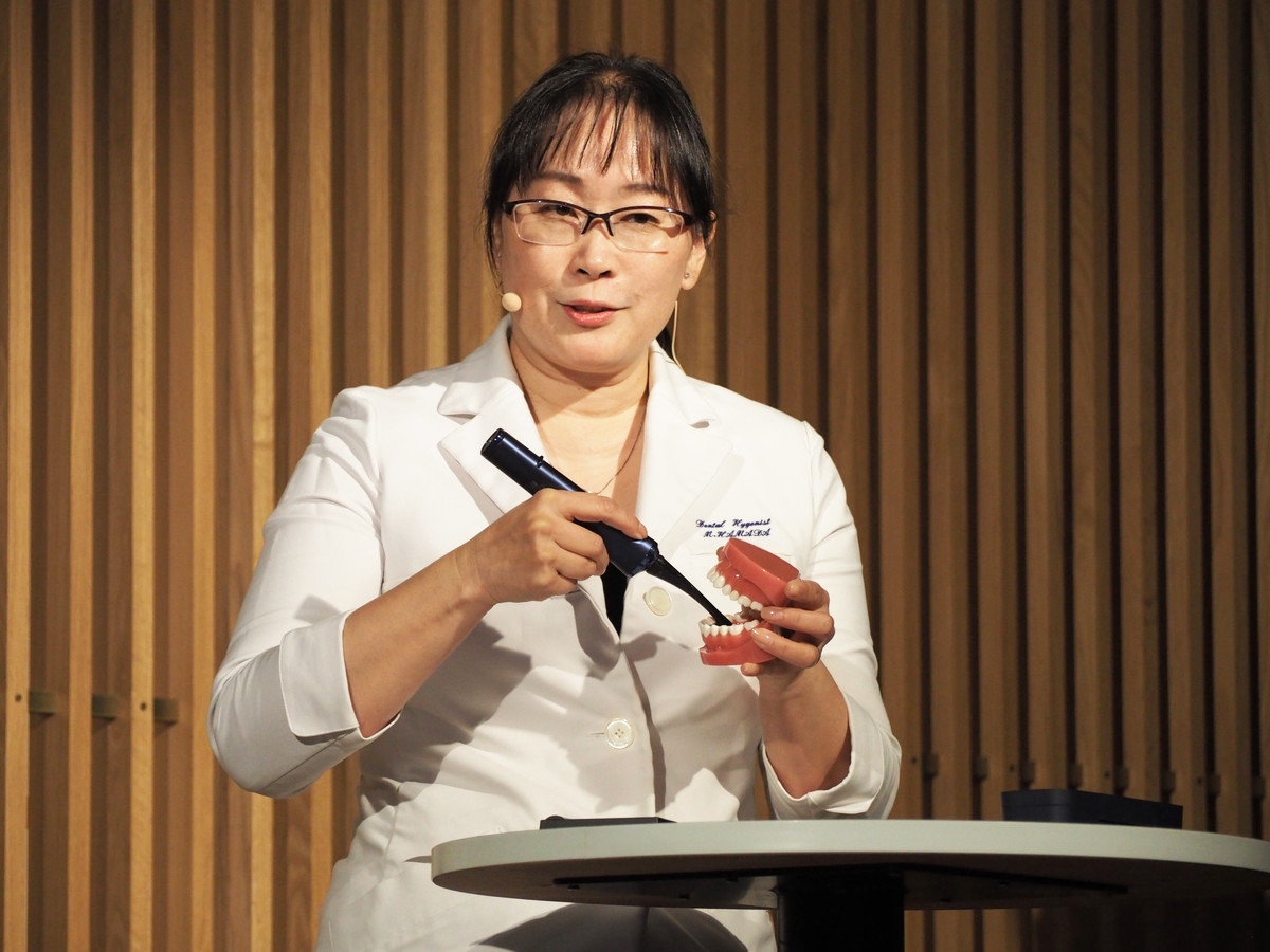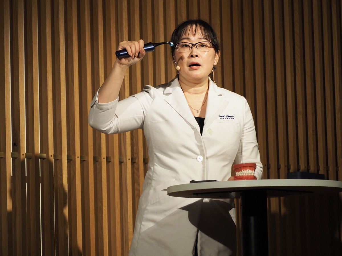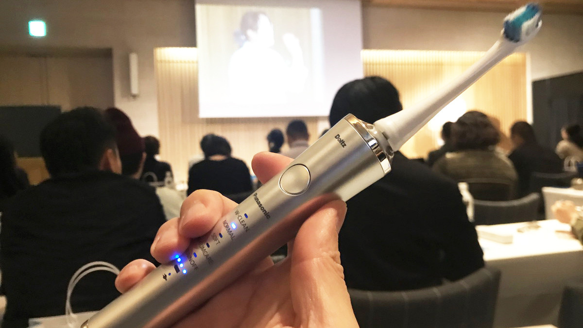 また、セミナーでは、歯科衛生士の濱田真理子氏によるEW-DP53を使った歯磨き指導が行なわれました。まずは持ち方から。子どもや高齢者など、握る力が弱い人は安定がしやすい、手のひらでぐっと握った持ち方をするのがオススメとのこと。一方、普通の握力の人は、ペンを握るような持ち方をするのがオススメだといい、こうすることで細かい動きもできるといいます。
