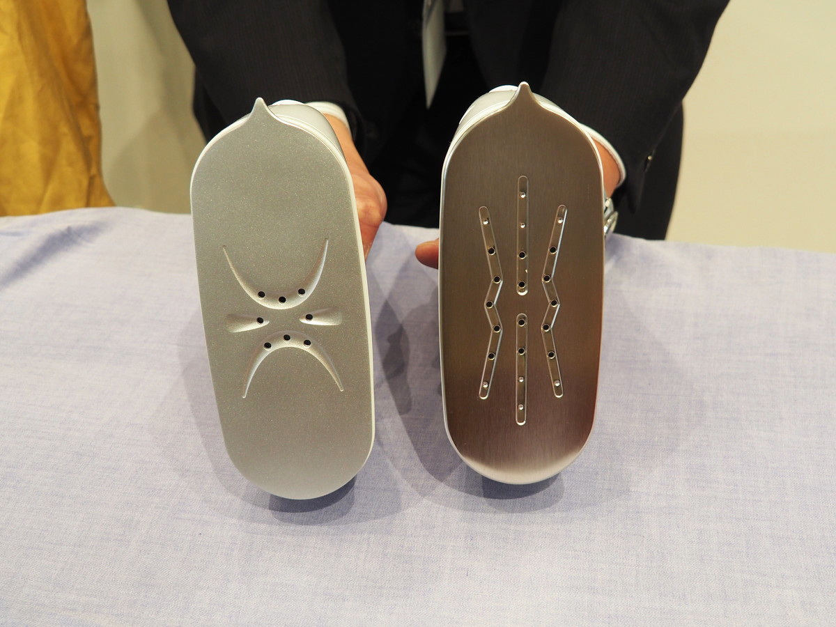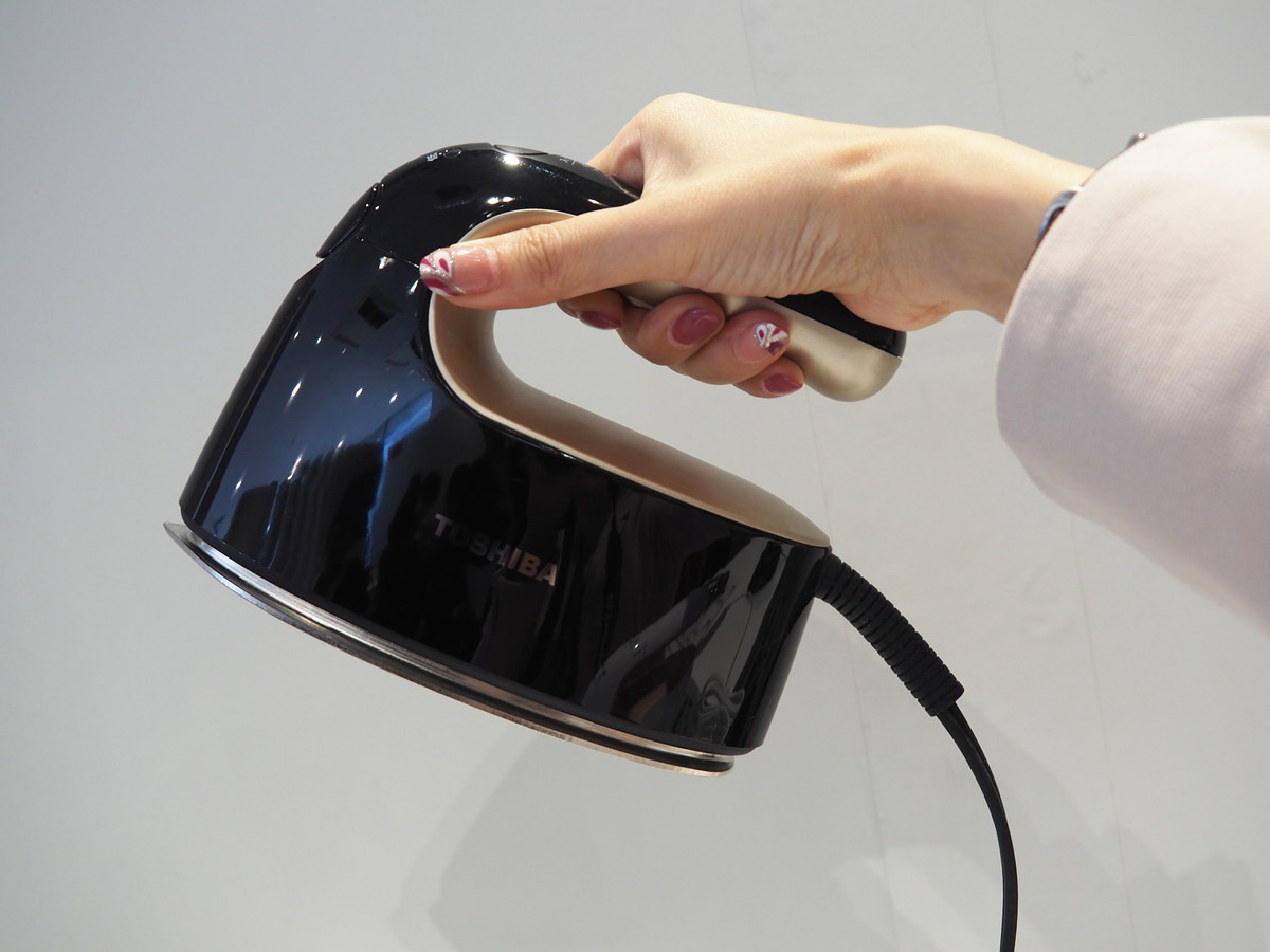 TAS-X5とTAS-V5の両製品ともに、衣類スチーマーとしてだけではなくプレスアイロンとしても利用可能です。かけ面には滑りのよいニッケルコートを採用しており、使用してみるとスルスルと軽い力でアイロンが衣類の上を滑るように動きます。また、プレス面は先がとがった形状をしており、ボタン周りなどの細かなシワも伸ばしやすいようになっています。