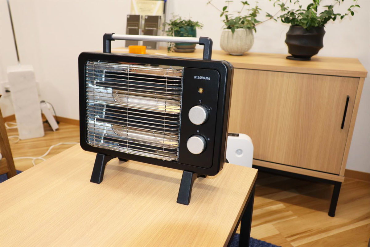 機能としては突出したものはないけど、デザインに特化した「遠赤外線電気ストーブ」の2機種も発売しました。レトロなデザインがおしゃれな感じで、機能としては入/切とヒーターの強(800W)/弱(400W)のダイヤル2つというシンプルさ。ブラックボディの「遠赤外線電気ストーブ 小型 ブラックコートヒーター ブラック KIEHDB-800」(参考価格1万800円・税抜)はブラックコートしたシーズヒーターを採用しており、体の芯まで熱が伝わり暖かさが持続します。ホワイトボディの「遠赤外線電気ストーブ 小型 遠赤外線ヒーター ホワイト KIEHD-800」(同6980円)は石英管を採用しており、スイッチを入れてすぐに発熱する即暖性が特徴。サイズはともに幅400×奥行き156×高さ377mm、質量2.3kg。