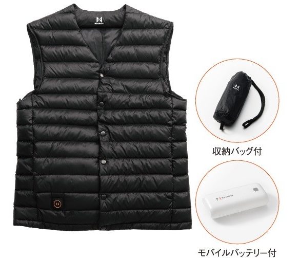 モバイルバッテリーの電力を利用するヒーティングウェア。発熱素材は一般的なポリエチレン袋と同様のわずか0.05mmの薄さを誇る「ナノフレキシブル加熱フィルム」を採用。スイッチを押した瞬間、10秒以内で約9℃温度が上昇する速暖性が特徴で、弱(40℃)/中(50℃)/強(65℃)の3段階の温かさが選べます。温かさは最大4時間持続。アウトドアや農作業などで汚れてしまった場合でも、ケーブル類をつけたまま洗濯機で丸洗いできるのも便利です。 デザインプロデューサーとしてスタイリストの大山旬氏を起用。普段着としても着こなせるデザイン性を追求しています。