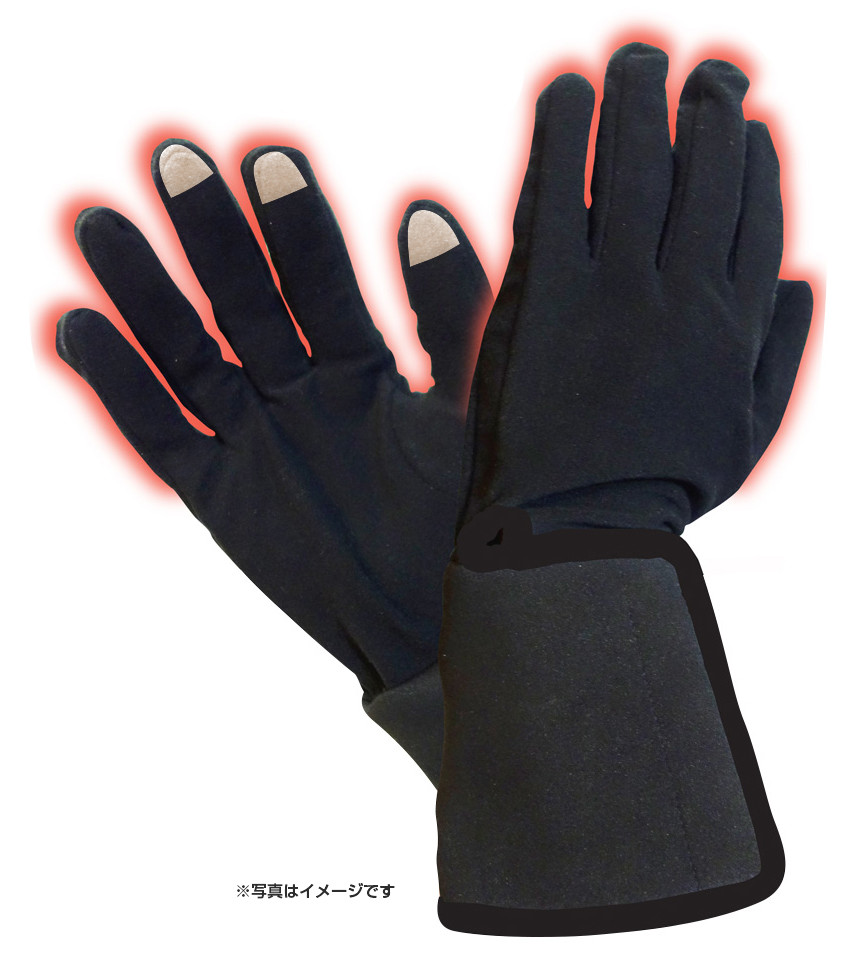 単三形乾電池を電源として使用するヒーター内蔵の手袋。 スイッチONで指の周辺が徐々に暖まっていく仕組みで、柔らかい起毛仕上げの繊維素材を使用し、三層構造となっているのでしっかり暖めてくれます。生地は伸縮性のあるストレッチ素材を使用しており、男女を問わず使用可能。 薄型で細かな作業も違和感なく行え、自転車のハンドルも握りやすくなっています。指先に磁気伝導素材を使用しているので、着用したままスマートフォンの操作できるのも便利。