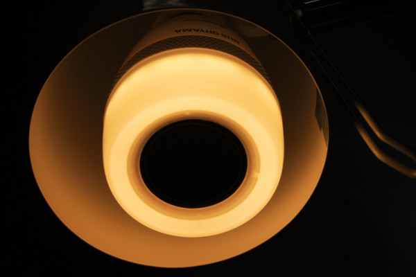それでは最初にライトとしての性能をチェックします。ライトスタンドに装着すると、温もりを感じられる明かりが辺りを照らしてくれました。暗い場所で使用してもしっかり手元を確認できるため、これなら読書もできそう。ちなみにライトはとても長寿命で、約4万時間取り替え不要です。
