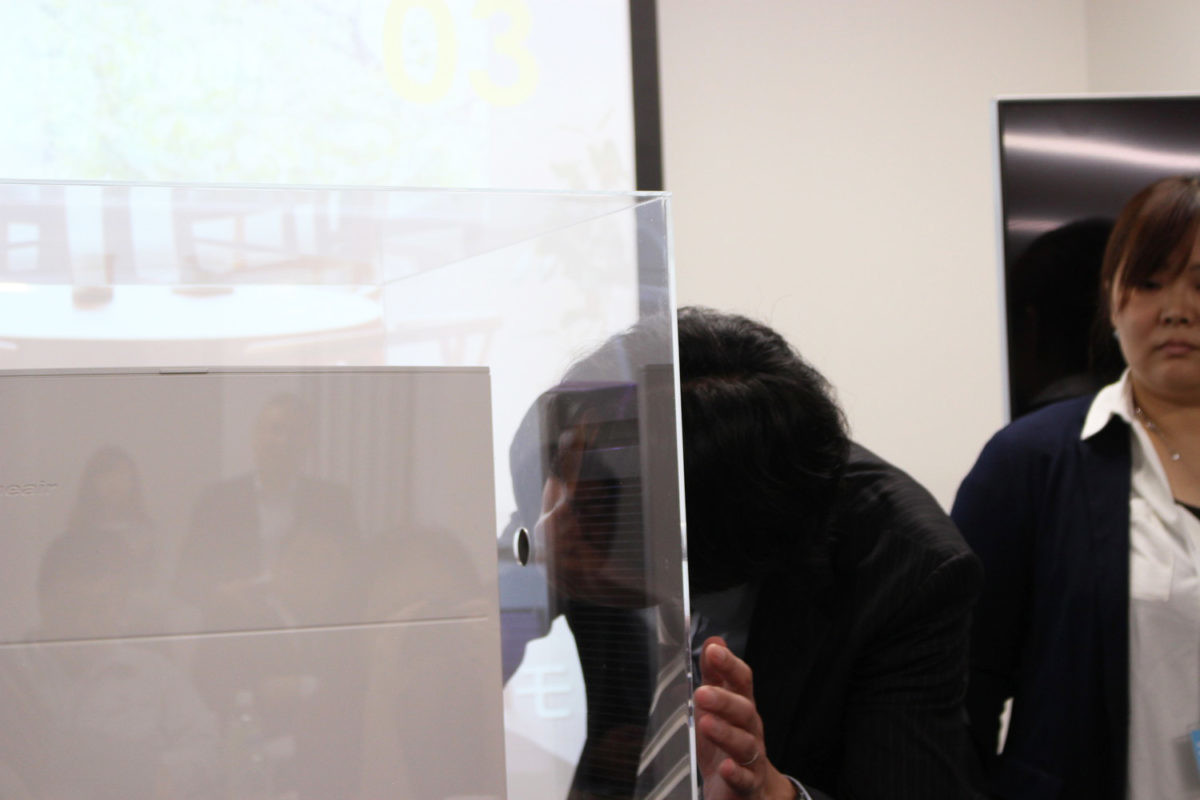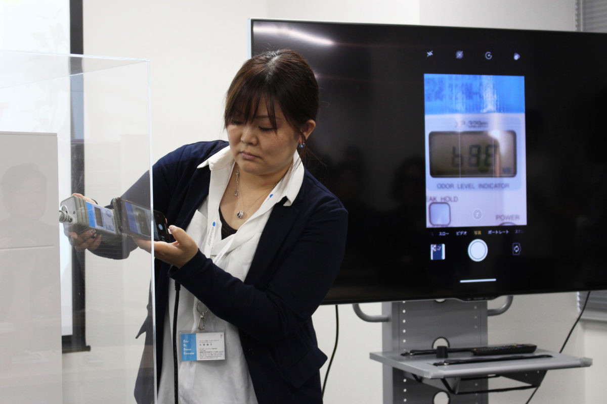 実際、ニオイはどこまで脱臭できるのか、会場では脱臭実験が行われました。まず「490i」を覆ったボックス内に、温めて臭いが立った焼肉のタレを入れます。1分経過後に臭気濃度を測定すると、数値は700近くまで上がりました。ちなみに、淹れたてのコーヒーが150、カレーが300、タバコの煙が600だそうなので、どれだけ強い臭いであるか分かります。