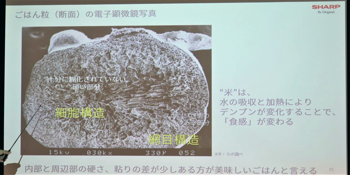下澤氏によると、米の内部は細胞を残して硬めに、外側は弾力のある網目構造にと、内外で食感を変えることで美味しさを感じるようになるとしています。吸水の温度と時間を変えることで、この食感を変化させることができるとのこと。炊き分けは、「ふっくら」「しゃっきり」「極上」の3つのメニューを搭載することとしました。