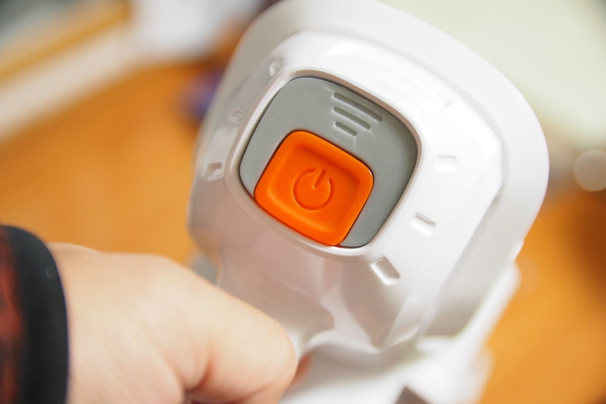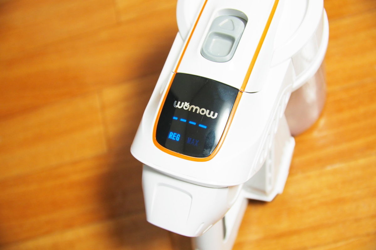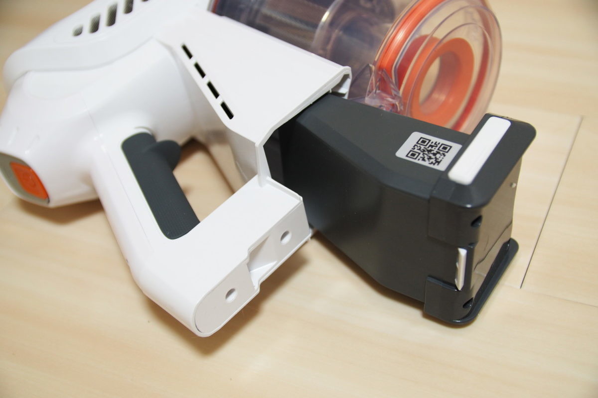 本体のフォルムはダイソンに近いが、スイッチはトリガーではなく、本体後部に配置。オレンジのボタンを押すと標準モードで動作し、グレーの部分を押すとMAXモードになる。