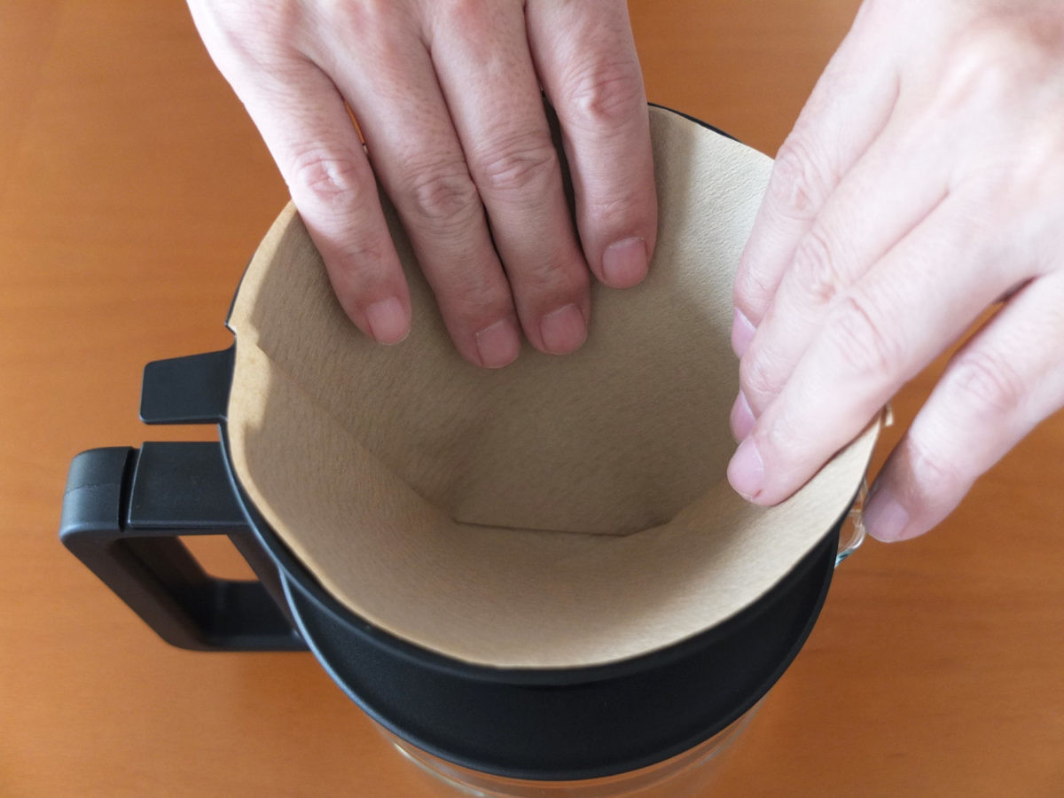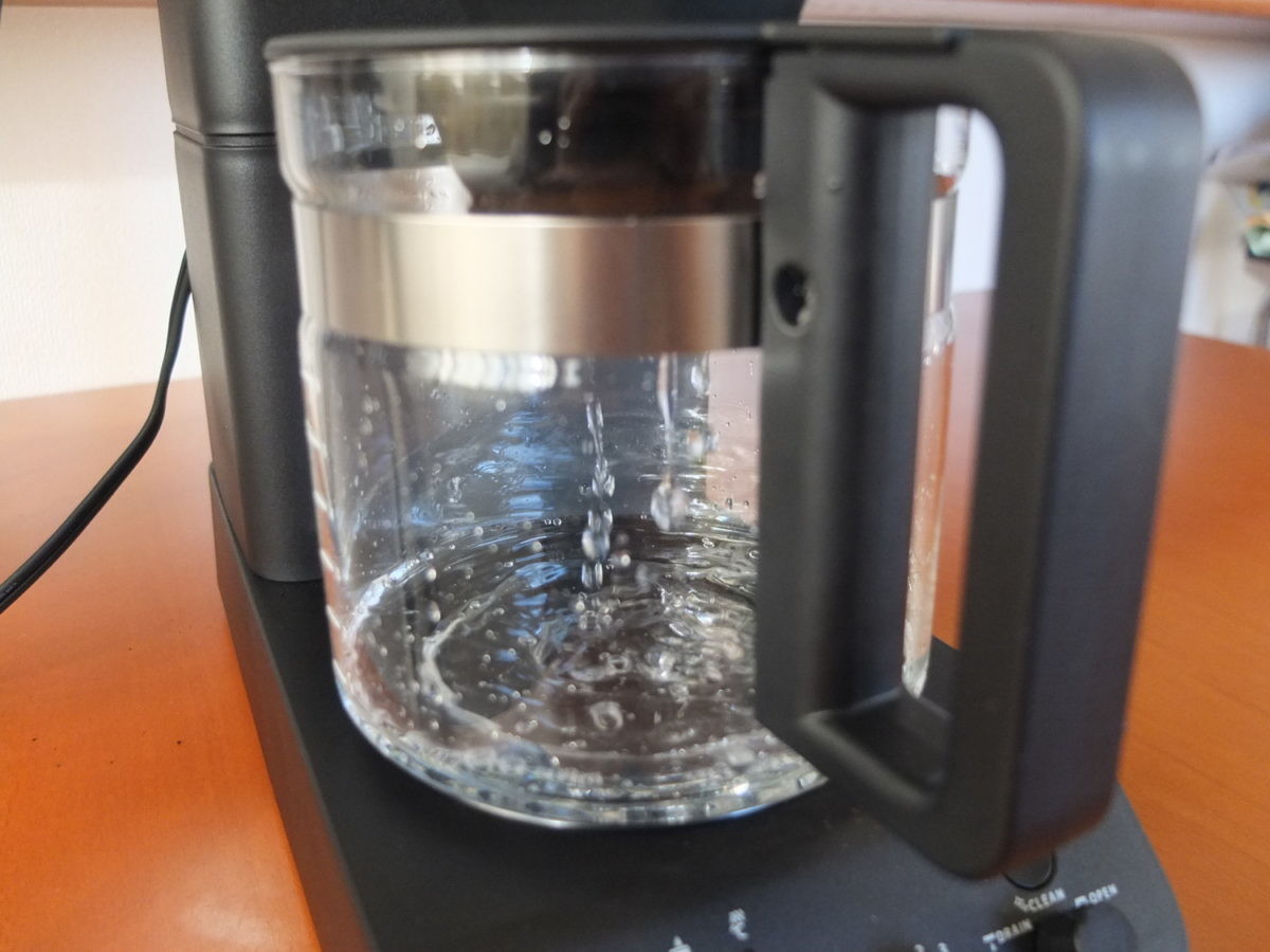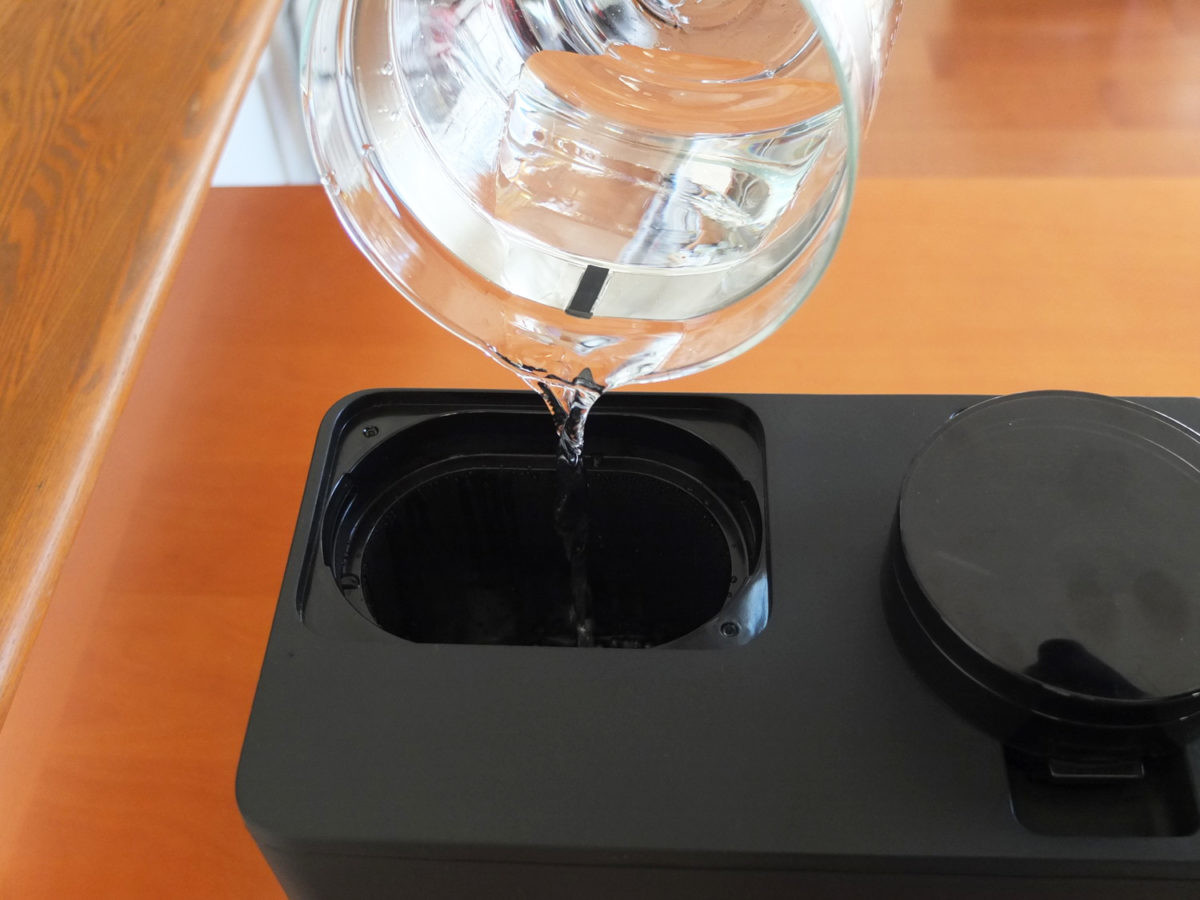 給水タンクは着脱式でなく本体据え付け型。付属のガラスサーバーでカップ数に応じた水量を計ってタンクに投入します。正確な水量を計れるのは便利ですが、本体を高い場所に置くと水が入れにくいのがやや難点でした。