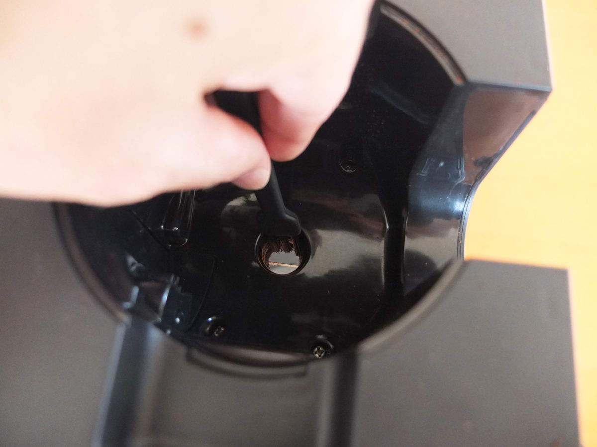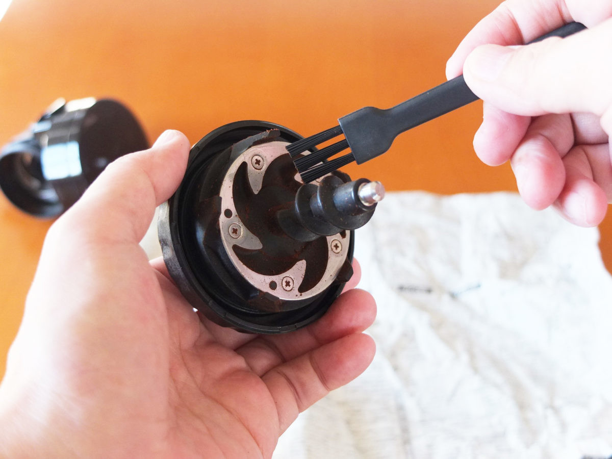 CM-D465Bが採用する臼式ミルは本来掃除がかなり面倒なのですが、本機のミルは着脱式になっていて、掃除がしやすいほうです。下に新聞紙などを引いて、刃の隙間などに詰まった粉も付属のブラシで手早く落とせます。