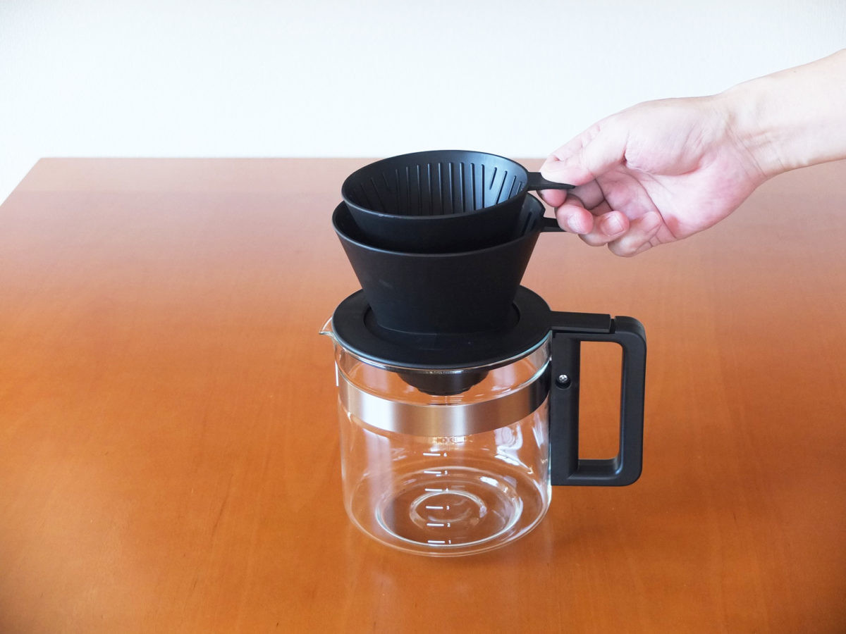 本機ではこの課題を「ドリッパー2つ重ね」で克服。1~3杯用のコーヒーを淹れる際に1~3杯用ドリッパーを4~6杯用ドリッパーに重ねることで、お湯の投入口からコーヒー粉までの距離にできるだけ差が出ないようにしたのです。また、蒸らし時の湯量やお湯を投入するタイミングも1~6杯で微妙に変え、杯数に関わらず、最もおいしいコーヒーが淹れられるようにしたそうです。