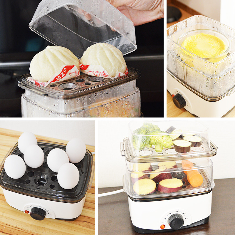 1台でさまざまな蒸し料理を調理できる手軽な電気蒸し器。水タンクに水を入れて食材を入れたら、あとはタイマーをセットするだけ。約30秒で蒸気が出てくる強力パワーで、餃子やシュウマイはもちろん、温野菜やゆで卵も作れます。肉も蒸し肉にすれば油が落ちてヘルシーに頂けます。