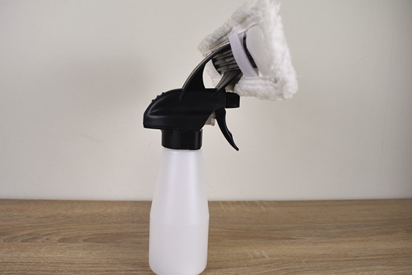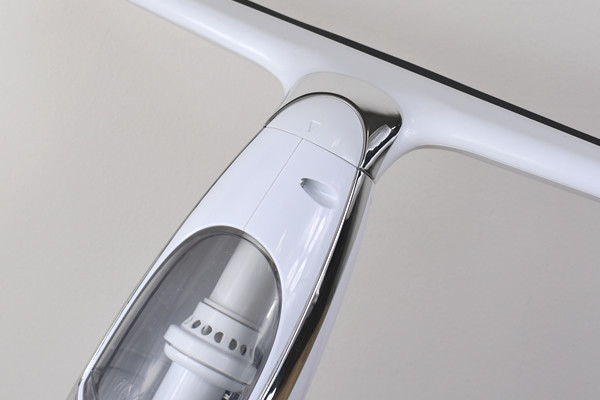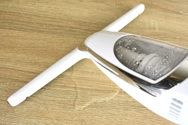 クリーナーのサイズは給水口を含めて350(幅)×280(高さ)×65mm(厚み)で、重量は片手でも楽々使える重さの430g。本体のセット方法は至ってシンプルで、ワイパーの形をした給水口を本体先端の溝にはめ込み、矢印に従って90度捻るだけ。給水口のセンターに刻まれた三角マークが本体の中心と一致すれば準備はOKです。同商品は満充電してあれば約30分使用が可能なので、1度掃除する分には充電量を心配する必要はありません。
