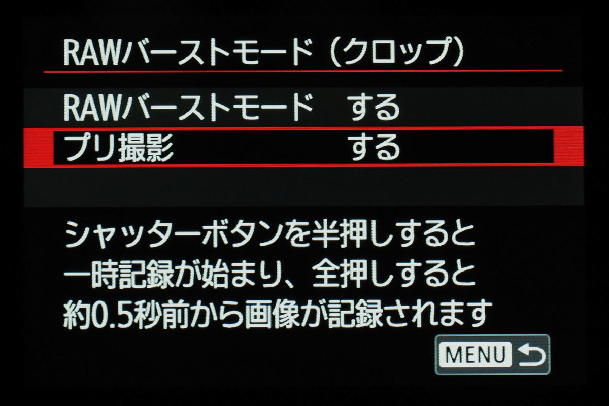 さらにEOS M6 Mark IIでは、シャッターを切る直前の瞬間も含めて連続的に記録できる「RAWバーストモード」も搭載。この機能を使えば、電子シャッターを用いて最大約30コマ/秒で記録できるほか、シャッターを押す0.5秒前からの記録も可能。最大約80コマまで撮影でき、撮影後に撮りたかった瞬間を切り出すことができるというモードだ。記録画素数は約1800万画素となるが、例えば、鳥が飛び立つ一瞬を狙いたい場合などに有効だろう。