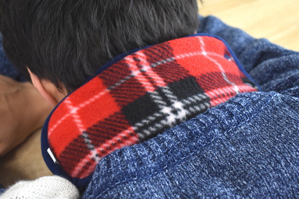 チェックカラーがオシャレな同商品は、目元だけでなく首元にも使用できるアイウォーマーです。サイズは約30×247×108mm、重さは330g程度。カバー表面のソフトボアはモコモコで、裏生地は肌触りのよいパイルとなっていました。