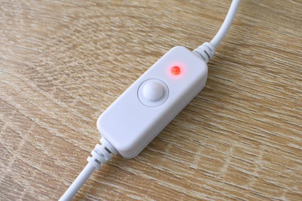ヒーターユニットから伸びるUSBケーブル(約1.6m)には、電源スイッチがついていました。電源を入れるとLEDランプが点灯し、しばらく待てばヒーターが温まって使える状態に。OFFにしたい時はもう一度スイッチを押すか、15分間使い続けましょう。“オートストップタイマー機能”を搭載しているため、自動で電源が切れます。なおACアダプタを用意することで、コンセントからも給電可能。