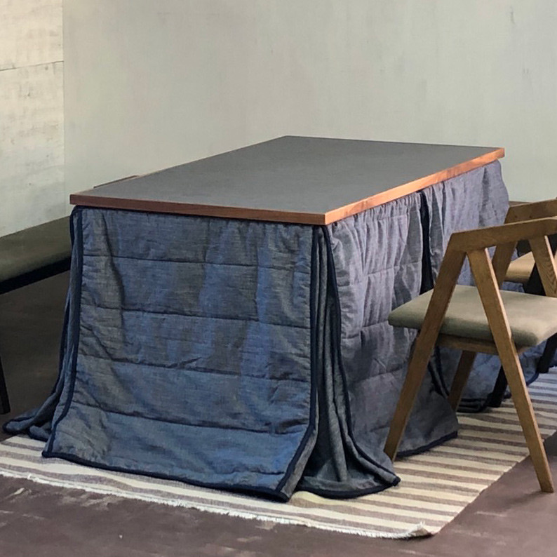 もちろん、いずれの暖房性能も十分です。このふたつのラインのテーブルには、メトロ電気工業のヒーターを採用し、実用性や使い勝手も十分です。また、こたつ布団もインテリアに馴染むシンプルで肌触りの良いものを複数用意し、お客さまにお選びいただけるようにしています。