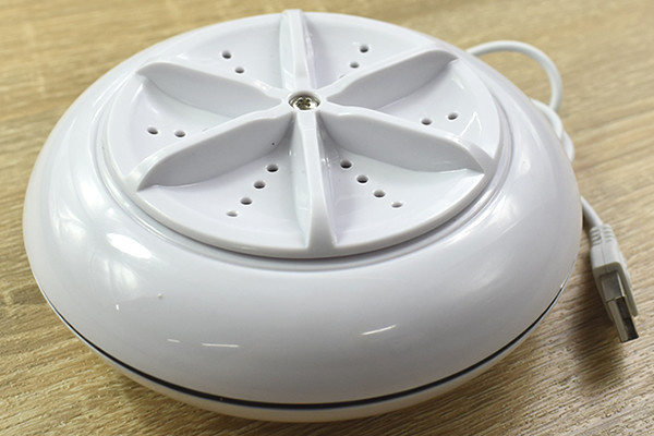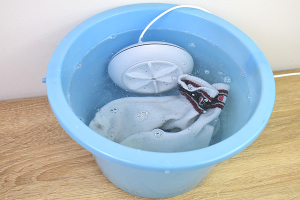バケツと水だけを用意すれば、即席洗濯機になるという同商品。“旅行中に服が汚れた時”や“長期出張で荷物を減らしたい時”など、かなり活用できる場面が多そうです。さっそく洗浄力を確かめるため、靴下を洗ってみましょう。付属の吸盤を本体の裏側にセットし、水を張ったバケツを用意。本体をバケツ内側の側面に貼りつけて靴下と洗剤を投入した後、USBケーブルをACアダプタに接続したらスタートです。すぐさま自動的に円盤が回転を始め、パワフルな水流を起こし始めました。想像した以上の回転力と水流にビックリしつつも、期待が高まります。