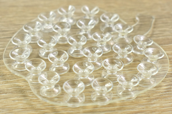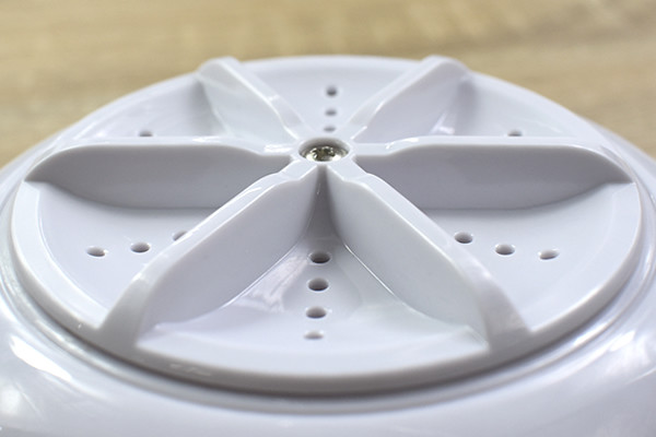「ちょこっとウォッシュ」の表面には洗濯機の底と同じ波板がついており、ここが独立して回転する仕組みになっています。大きさは約130(幅)×130(高さ)×53(厚み)mmほどで、重さも約250g。一般的なペットボトル飲料よりコンパクトなサイズなので、旅行カバンに詰めても邪魔になりませんね。