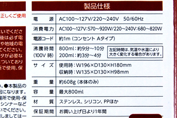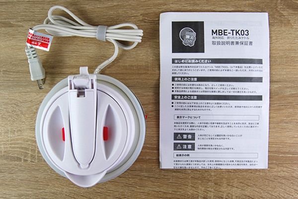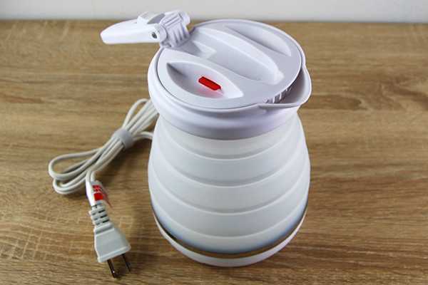 カラーはライトブルーとホワイトから選べますが、今回はホワイトをチョイスしました。折りたたんだ状態の高さは約10cmほど。沸かせるお湯の量は800mlなので、2~3人分のお湯が必要な時も活躍する大容量サイズです。