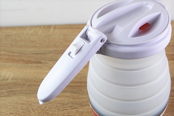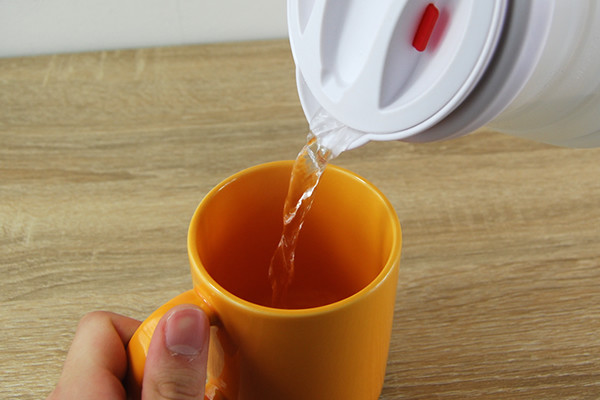 フタを開けて満杯になるまで水を入れ、下部のスイッチをオンに。800mlだとおよそ10分ほどでお湯が沸きました。注ぐ際もシリコンがへたれることなく、普通のケトルと同じように注ぐことができます。