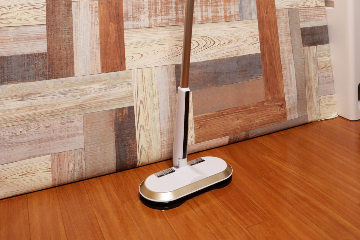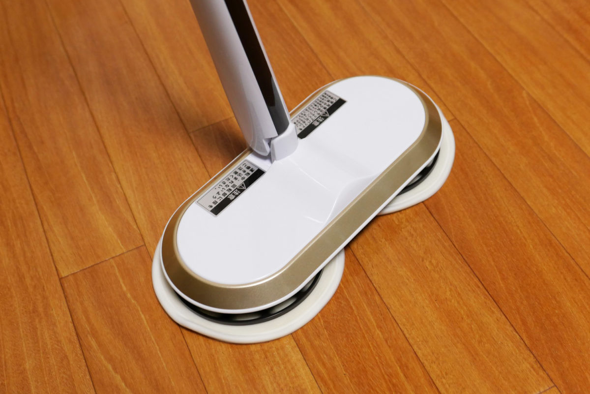 モップパッドを本体に取り付けたら準備は完了。拭き掃除をしたい場所でグリップにあるスイッチを入れると、左右のモップパッドが回転を始めます。あとは本体を前後に動かしながら拭き掃除をしていくだけ。