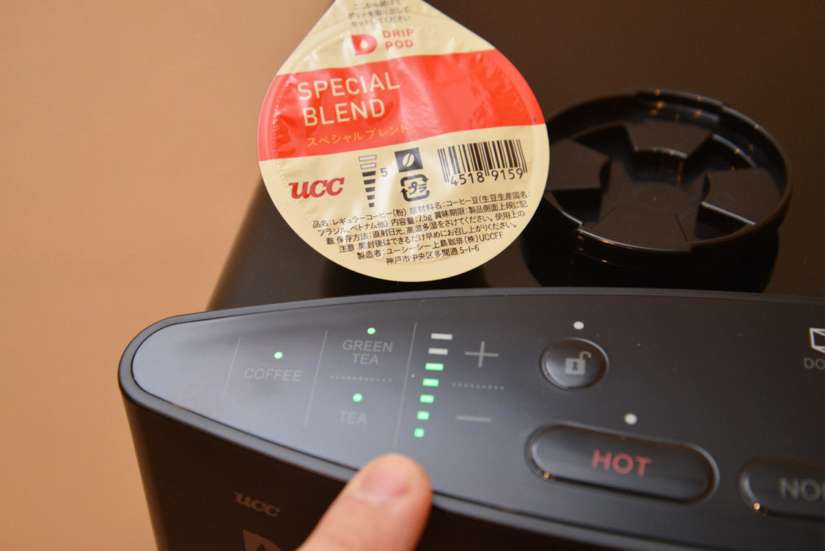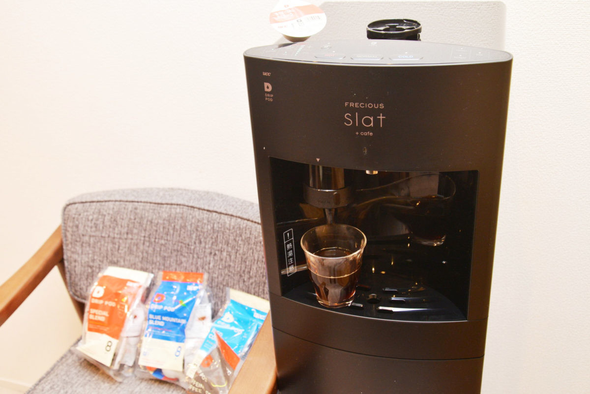 本体の設置もラクラクでしたが、コーヒーの抽出もとてもカンタン。付属のホルダーをウォーターサーバーにセットして、ボタンを押すだけ。なお、ドリップポッドはただお湯をポッドに通過させるのではなく、ちゃんとおいしくコーヒーが抽出されるよう、蒸らしや湯温も計算されている点が秀逸です。カプセルタイプなので、抽出が終わったらそのままポッドを取り出して捨てられます。