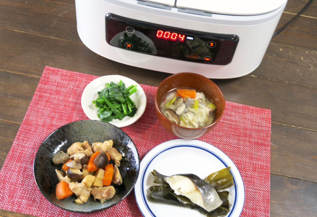 筑前煮も豚汁も途中でフタを開けても問題なさそうなので、今回は蒸しトレイの食材の様子を見つつの調理になりました。本来、「煮込み」は40分、「スープ」は30分が初期設定の調理時間となっているのですが、水煮の野菜を使ったこともあり、30分弱ですべての料理が完成。以下が完成した4品です。