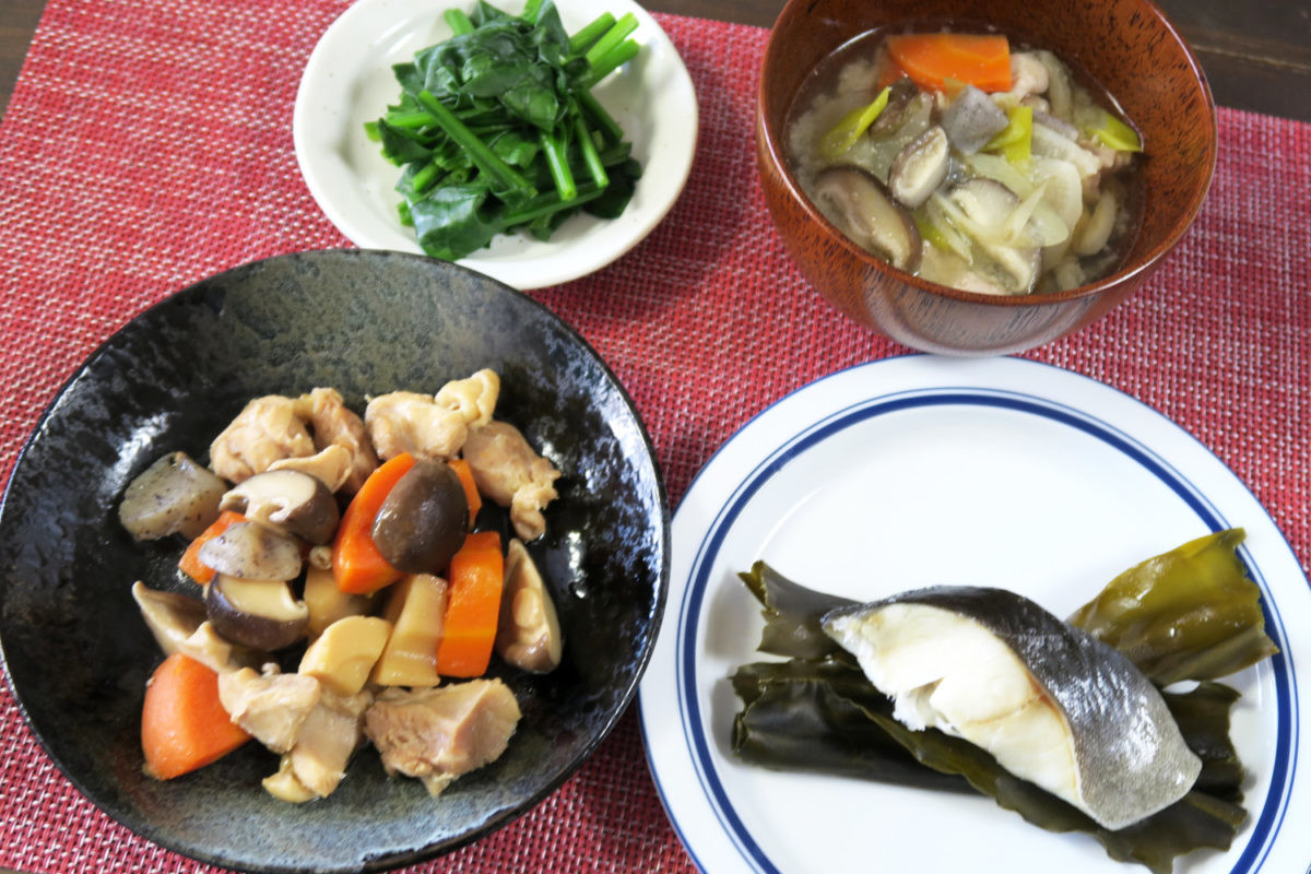 選んだのは「筑前煮」「豚汁」「白身魚の酒蒸し」「ほうれん草蒸し」。和食メニューをツインシェフで一気に作ろうという算段です。筑前煮は「煮込み」、豚汁は「スープ」、ほうれん草と魚は蒸しトレイで調理します。