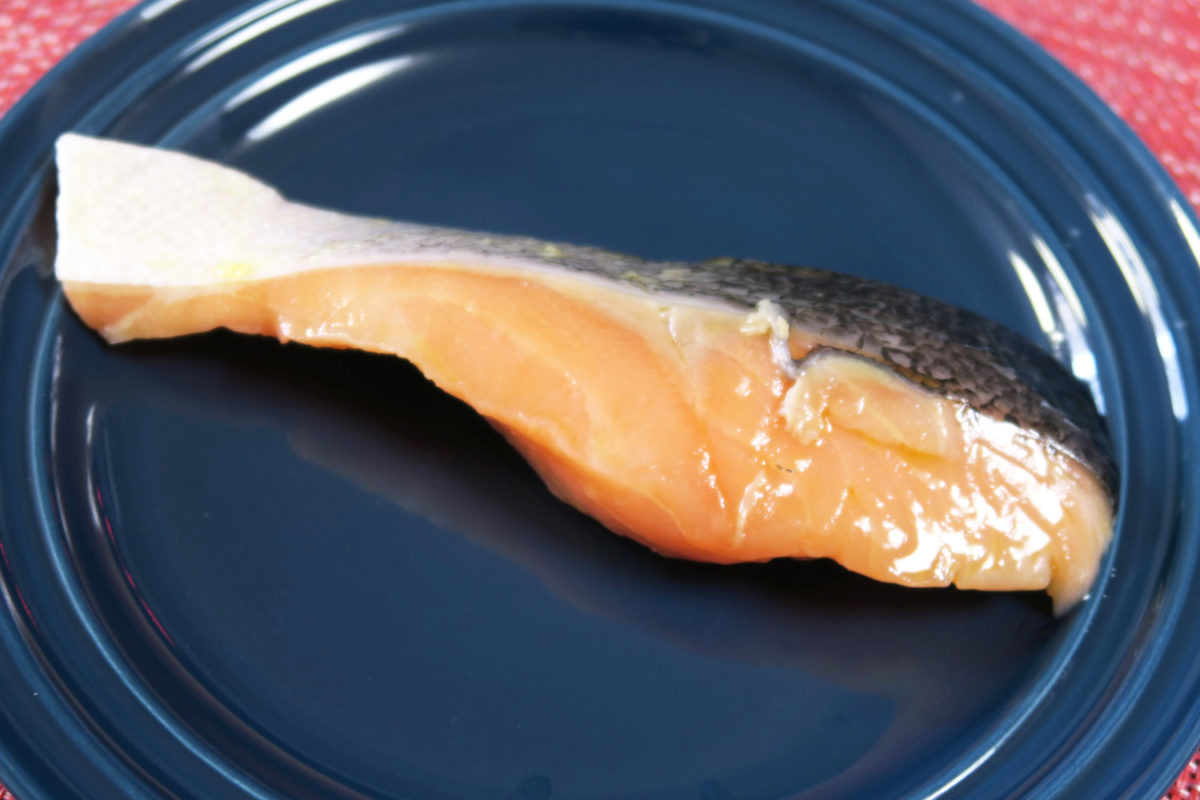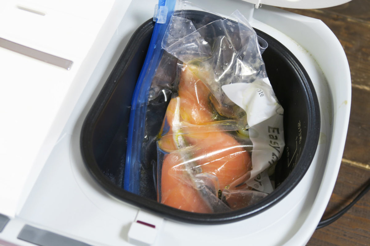 せっかくなので手動調理で「サーモンのコンフィ」を作ってみることにしました、コンフィとは、オイルなどに漬けて低温でじっくりと火を入れるフランスの伝統的な調理法。まずは塩水にサーモンを漬け込み、表面の水分を拭き取ります。あとは、チャック付きのポリ袋にオリーブオイルとサーモンを入れ、水を入れた内なべで40度で1時間加熱すればOK。